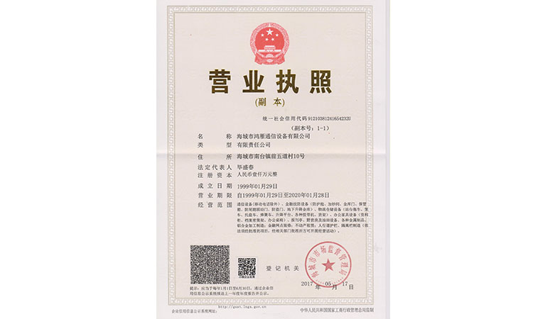 海城市鴻雁通信設(shè)備有限公司成立于1985年,位于海城市鞍海公路東側(cè),交通便利。注冊(cè)資金1000萬,占地面積17800平方米,職工120人,年產(chǎn)值600多萬。法人代表畢盛春,曾多次獲得“中國誠信企業(yè)家”稱號(hào)。